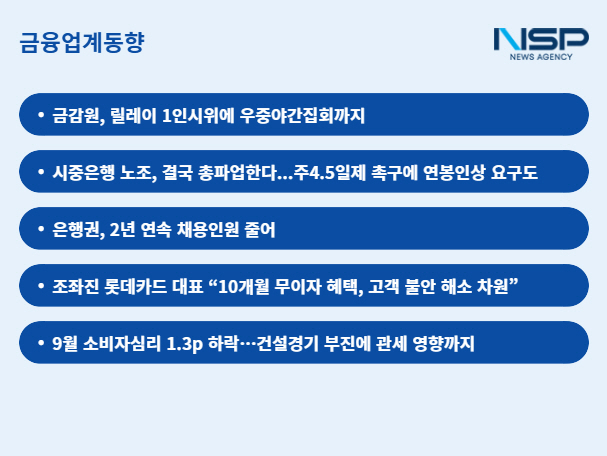 (서울=NSP통신) 강수인 기자 = 금융당국은 임원사표에 우중 야간집회까지 불사하고 있고 시중은행들은 임금을 올려달라며 총파업을 예고하고 있다. 대형 해킹사고가 발생한 롯데카드에선 조좌진 대표가 사임 의사를 밝히기도 했다. 금융권의 혼란이 가중되고 있다.