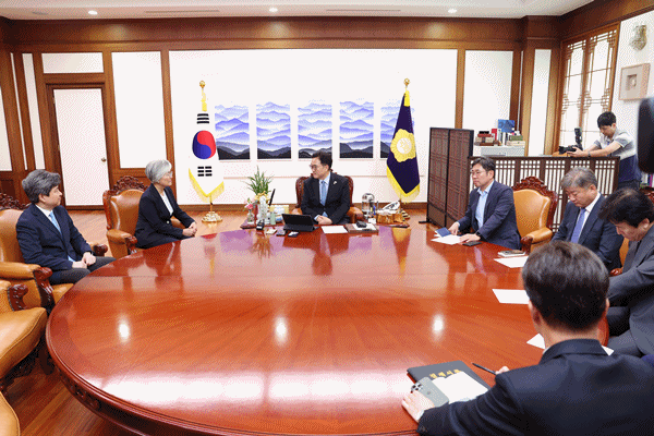 (서울=NSP통신) 강은태 기자 = 우원식 국회의장은 29일 오후 의장집무실에서 강경화 주미대사 내정자를 접견했다.