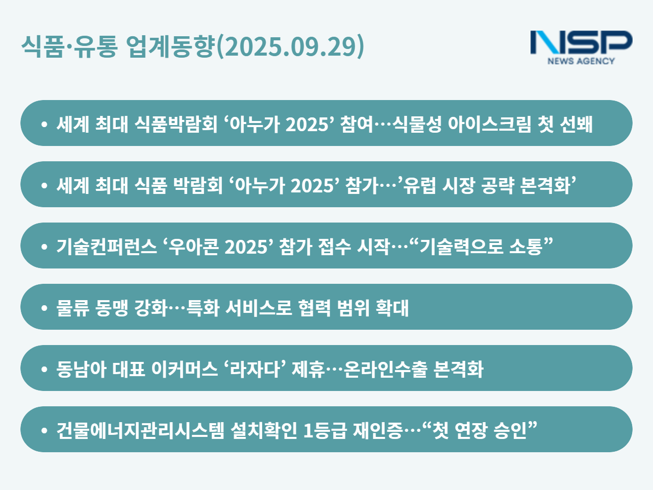 (서울=NSP통신) 옥한빈 기자 = 빙그레와 대상은 독일 ‘아누가’ 박람회 무대에서 K-푸드 깃발을 들고 유럽 시장 공략에 나섰고, 배달의민족은 개발자들의 축제 ‘우아콘’으로 기술력 과시를 예고했다. 한편 물류전선에선 한진과 네이버가 손을 맞잡아 ‘동맹’을 강화했고, G마켓은 알리바바 산하 라자다와 제휴하며 동남아로 눈을 돌렸다. 업계의 시선은 모두 ‘연결’과 ‘협력’이라는 키워드에 꽂힌 듯하다. 풀무원은 에너지 절감 성과를 입증하며 친환경 건축물 운영의 모범 사례로 주목받았다. 화려한 박람회, 굵직한 제휴, 똑똑한 기술 컨퍼런스까지 이번 주 식품·유통 업계는 ‘따로 또 같이’ 미래를 설계하는 풍경이다.