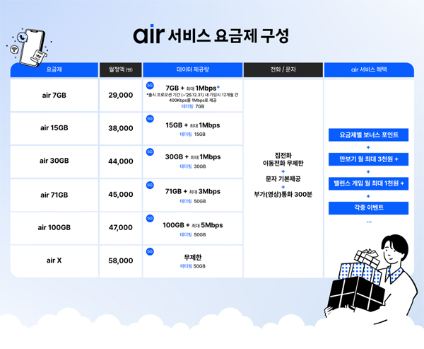 에어 요금제는 5G 데이터 기준 6개 구간으로 단순화했으며 2만9000원(7GB)부터 5만8000원(무제한)까지 구성된다.