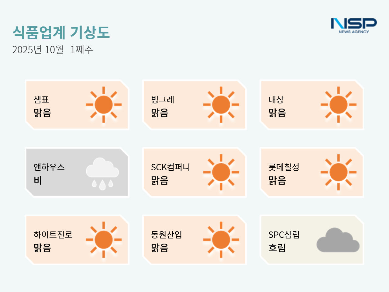 (서울=NSP통신) 옥한빈 기자 = 이번 주 식품업계 하늘은 세계 최대 식품 박람회 ‘아누가(Anuga) 2025’가 그려낸 청명한 푸른빛이었다. 샘표·빙그레·대상·롯데칠성·동원산업이 일제히 글로벌 무대에 나서며 K-푸드의 경쟁력을 증명했고, 하이트진로는 ESG와 사회공헌 활동으로 햇살에 힘을 더했다. 커피업계는 SCK컴퍼니(스타벅스)가 스타벅스의 ‘별별 마케팅’으로 추석 대목을 정조준하며 특‘별’한 그림이 나왔지만 앤하우스(메가MGC커피)는 가맹점주 불공정 행위가 드러나 23억 원대 과징금을 부과받으며 국감 시즌을 앞두고 세찬 비를 맞았다. SPC삼립은 여전히 국정감사 증인 채택 논란의 구름에서 벗어나지 못했고, 여론의 바람도 매섭다. 이번주 식품업계의 기상도는 글로벌 무대와 ESG로 웃는 기업들과 칼바람을 피하지 못한 기업들의 다른 양상이었다. 과연 기업드른 뒤늦은 우천 대비가 가능할지도 관심사다.
