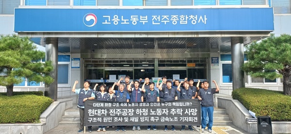 (서울=NSP통신) 강은태 기자 = 전국금속노동조합(이하 금속노조)가 지난 3일 현대차(005380) 전주 트럭 도장1공장 2층에서 덕트 설비 철거 중 추락해 사망한 하청노동자(대영기계)와 관련해 원청인 현대차의 책임을 촉구하고 나섰다.