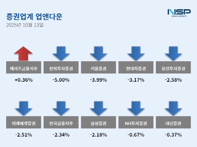 (서울=NSP통신) 임성수 기자 = 13일 코스피(-0.72%) 하락, 코스닥(+0.12%)은 상승했다. 증권주는 전 거래일 대비 1.69% 하락했다. 증권주 38종목 가운데 상승은 2개, 보합 3개, 하락 33개다.