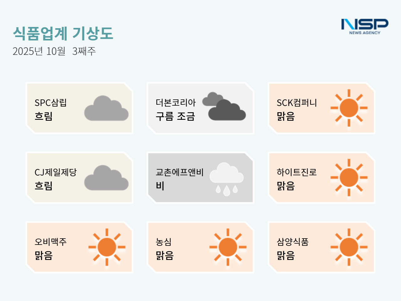 (서울=NSP통신) 옥한빈 기자 = 추석 대목이 지나자 식품업계는 국정감사 시즌의 찬바람을 맞았다. 글로벌 시장에서는 K-푸드의 기세가 여전하지만, 국내 시장에서는 규제와 질타가 빗발친다. 특히 SPC는 APEC 정상회의 공식 협찬사로 이름을 올리며 실적 개선의 햇살을 엿봤지만, 여전히 ‘산재의 그늘’에서 벗어나지 못했다. 더본코리아 역시 상생 행보를 내세웠으나 증인 출석을 앞두고 구름이 드리운 형국이다. 반면 스타벅스를 운영하는 SCK컴퍼니는 ‘라떼 5천만 잔 돌파’의 훈풍 속에 일찌감치 크리스마스 시즌을 선점하며 맑은 하늘을 유지했다. 교촌에프앤비는 ‘꼼수 인상’ 논란으로 기압이 급격히 떨어졌고, CJ제일제당은 구조조정 바람 속에서 불안한 흐름을 이어간다. 이번 주 하늘은 전반적으로 ‘실적은 맑음, 평판은 흐림’ 기업의 체질보다 신뢰의 기온이 더 중요한 계절이다.