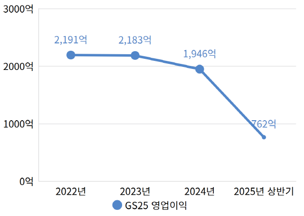 GS25의 실적을 살펴보면 매출은 매년 소폭씩 상승했지만 영업이익은 지속 하락했다. ▲2022년 2191억 원 ▲2023년 2183억 원 ▲2024년 1946억 원 ▲2025년 상반기 762억 원이다. 올해 상반기 실적은 전년비 16.4% 하락한 수치로 이에 전체 영업이익 또한 부진을 면치 못할 전망이 된다.