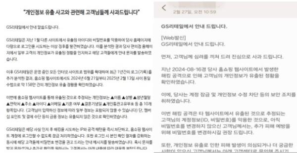 GS리테일이 2월 27일 홈페이지 팝업창을 통해 공지한 사과문 캡처(왼쪽)과 개인정보 유출 피해를 입은 고객에게 보낸 문자 메시지 캡처(오른쪽) (이미지 = GS리테일 홈페이지 및 익명의 GS홈쇼핑 고객 모바일 폰)