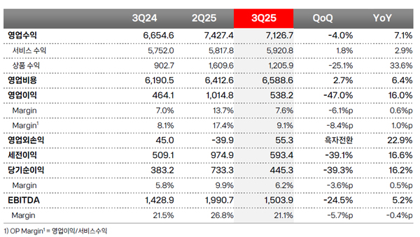 (서울=NSP통신) 이복현 기자 = KT(030200)가 2025년 3분기 연결 기준 매출(영업수익) 7조1267억 원, 영업이익 5382억 원을 기록했다고 밝혔다.