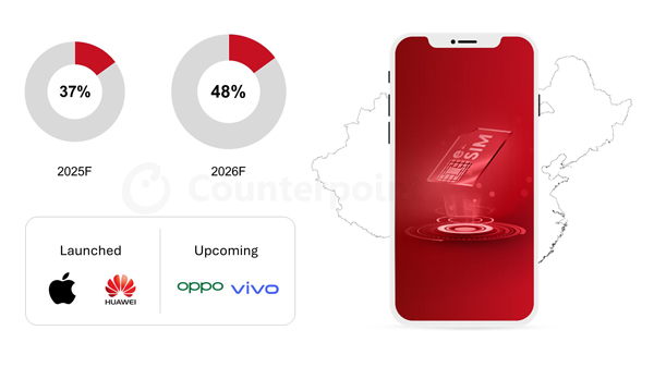 카운터포인트리서치에 따르면 eSIM 스마트폰은 2025년 전 세계 스마트폰 판매의 37%, 2026년에는 48%를 차지할 것으로 예상된다.