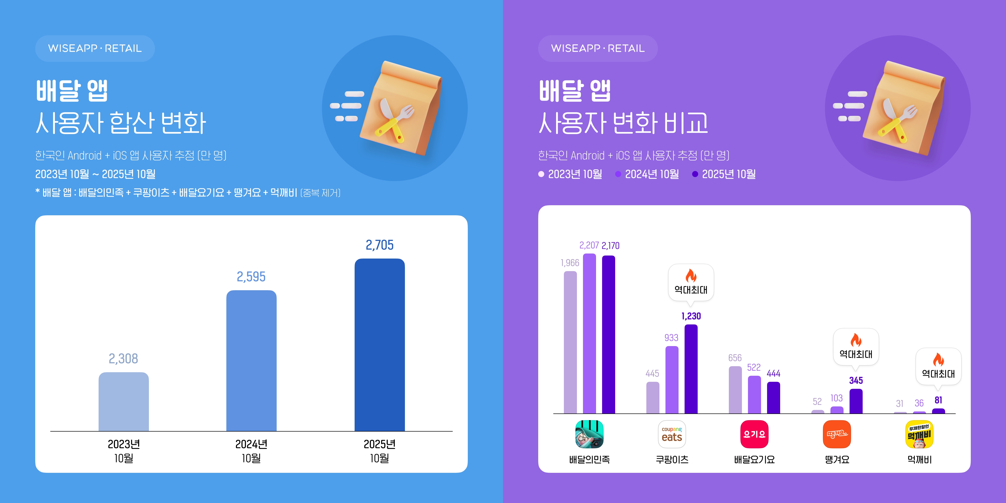 와이즈앱·리테일의 조사에 따르면 지난 10월 주요 배달앱(배달의민족, 쿠팡이츠, 요기요, 땡겨요, 먹깨비) 사용자 합산 수는 2705만 명으로 전년 동기 대비 4% 증가했다. 이로써 배달앱 시장은 최근 3년 연속 사용자 수 상승을 기록하게 됐다.