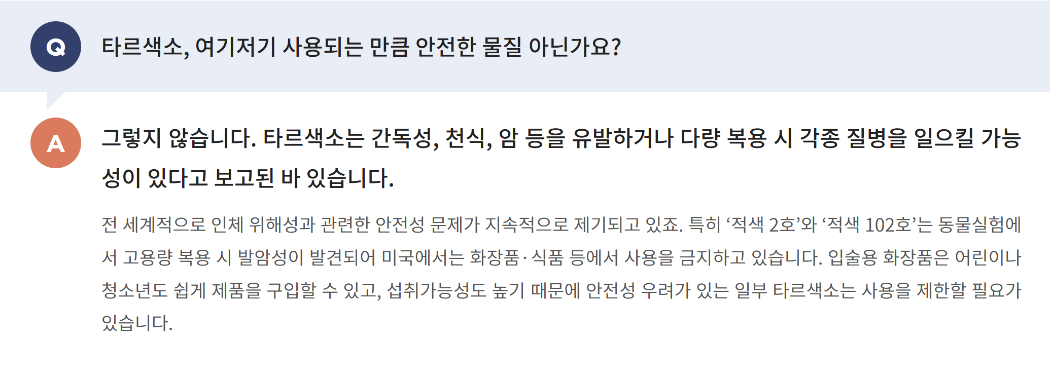 타르색소에 관한 연구와 조사는 지속적으로 진행되고 있으며 한국소비자원은 또 다른 타르색소 제품 관련 조사에서 타르색소가 안전한 것 아닌가에 대한 질문에 “그렇지 않다”고 답했다.
