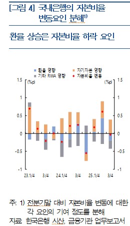 실제 환율 상승폭이 컸던 2024년 4분기 중 은행 자본비율이 큰 폭으로 하락한 바 있는데 전분기말 대비 자본비율 변화를 환율 영향에 따른 RWA(장외파생 포함) 변화, 자기자본 변화, 신용RWA(파생 제외) 변화, 시장 및 운영 RWA 변화 등으로 각각 분해할 경우 자본비율 하락에 대한 환율 상승의 기여도가 상당한 것으로 추정됐다.