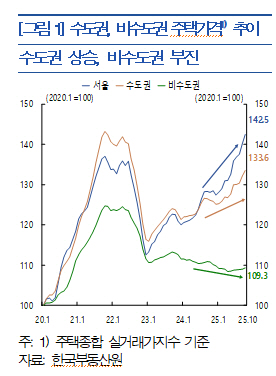 한은에 따르면 서울이 주택가격 상승을 주도함에 따라 서울 아파트 시가총액이 전국에서 차지하는 비중(2025년 11월말 현재 43.3%)이 큰 폭 상승해 전고점(43.2%, 2020년 8월말) 수준을 상회하고 전체 가계대출(예금취급기관 기준)에서 서울이 차지하는 비중도 34.2%(2025년 9월말)까지 상승했다.