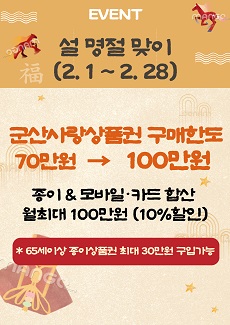 (전북=NSP통신) 김광석 기자 = 전북 군산시가 설 명절을 맞아 2월 한 달간 군산사랑상품권의 1인당 월 구매 한도를 기존 70만원에서 100만원으로 한시적으로 상향한다고 26일 밝혔다.