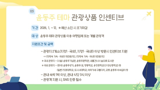 기타 윤동주 관련 국내·국외 연계 관광지와 세부 지원 기준, 제출 방법과 제출 서류 등 자세한 내용은 광양시청 누리집 공고란을 참고하면 된다.