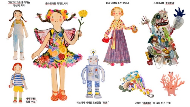 28일 공개된 캐릭터는 에바 알머슨 특유의 그림체로 창조된 주인공 ‘리나’의 꽃으로 무장된 슈퍼히어로 모습과 그림그리기를 좋아하는 변신 전 순수 소녀다운 모습 외 말썽꾸러기 동생 ‘미노’, 리나에게 플라워 파워를 심어준 할머니, 미노에게 버려진 로봇 인형 ‘딩동’, 거대한 쓰레기 괴물 ‘붙어붙어’, 플라스틱 쓰레기를 먹고 괴물이 된 거북이 ‘먹어먹어’와 그의 친구 ‘산호’ 등이다.