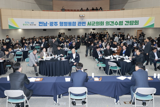(전남=NSP통신) 김성철 기자 = 전라남도의회는 지난 29일 전남도청 왕인실에서 전남·광주 행정통합과 관련해 도의원과 시·군의회 의원 등이 참석한 가운데 의견수렴 간담회를 개최하고 행정통합 추진 과정에서 제기되는 다양한 현장의 의견과 우려를 공유했다.