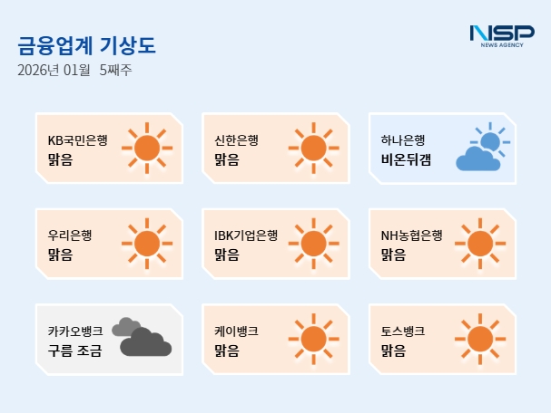 (서울=NSP통신) 강수인 기자 = 2026년 1월 5주차 금융업계기상도는 KB국민은행·신한은행·우리은행·IBK기업은행·NH농협은행·케이뱅크·토스뱅크의 ‘맑음’, 하나은행 ‘구름뒤갬’, 카카오뱅크의 ‘구름조금’으로 기록됐다.