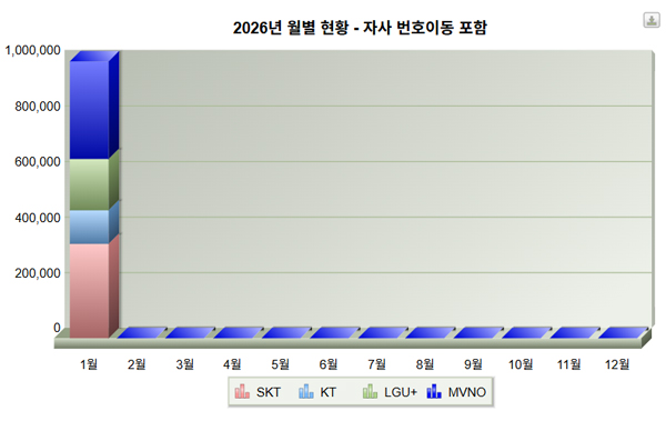 한국통신사업자연합회(KTOA)가 발표한 이동전화 번호이동자 수 현황에 따르면 12월(59만3723명)보다 40만5621명 늘었고, 2025년 1월(50만4814명) 대비로는 49만4530명 증가했다.