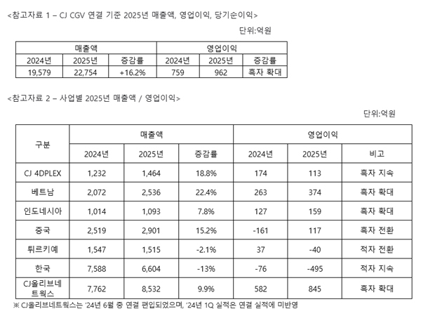 해외 극장 사업도 성장했다. 베트남에서 매출 2536억 원, 영업이익 374억 원을 기록했고, 인도네시아는 매출 1093억 원, 영업이익 159억 원으로 집계됐다. 중국은 매출 2901억 원, 영업이익 117억 원으로 흑자 전환했다.