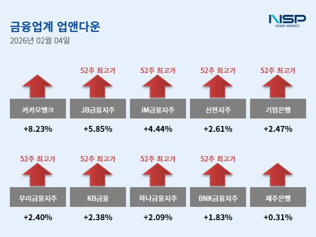 이날 JB금융지주, iM금융지주, 신한지주, 기업은행, 우리금융지주, KB금융, 하나금융지주, BNK금융지주는 52주 신고가를 기록했다.