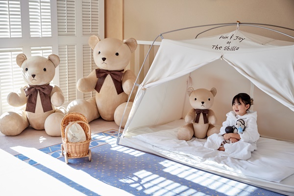 객실에는 아이들이 좋아하는 키즈 텐트를 설치하고, 소·중·대형 신라베어 인형과 신라베어 자수 쿠션, 신라베어 자수 키즈 배스로브 등 신라베어 테마 소품을 비치해 아이 눈높이에 맞춘 공간으로 완성했다.