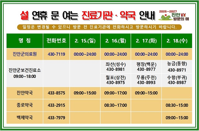 10일 군에 따르면 설 연휴 기간 비상 진료 기관은 지역 응급의료 기관인 진안군 의료원을 비롯해 휴일 지킴이 약국 3개소로 일자별·당번제로 지정 운영된다.