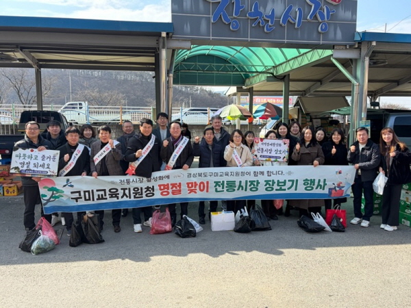 (경북=NSP통신) 김대원 기자 = 경상북도구미교육지원청(교육장 민병도)은 지난 10일 민족 최대의 명절인 설을 맞아 지역 상권에 활력을 불어넣고 전통시장 이용 분위기를 확산하기 위해 구미 장천시장에서 설맞이 장보기 행사를 실시했다.