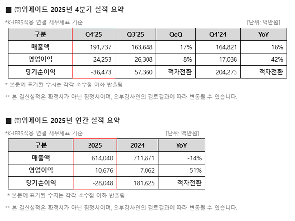 위메이드, 25년 4Q 전년比 매출 16%↑·영업이익 42%↑