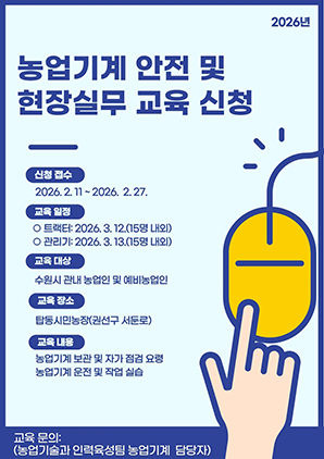(경기=NSP통신) 조현철 기자 = 경기 수원시(시장 이재준)가 ‘2026년 농업기계 안전 및 현장실무 교육’ 수강생을 오는 27일까지 모집한다. 지역내 (예비)농업인이 참여할 수 있다.
