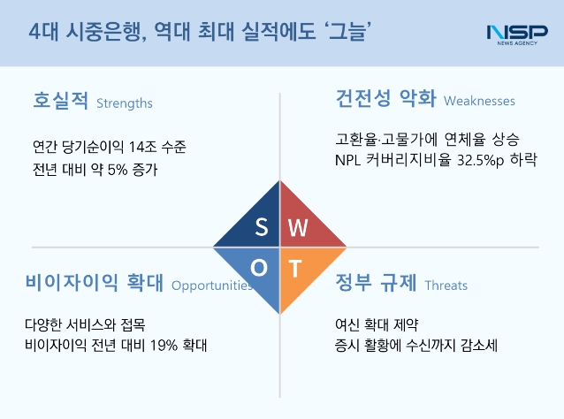 ◆‘Weakness(약점)’= 이같은 호실적에도 은행권의 표정이 어두운 이유는 대출이 확대된 만큼 부실대출도 늘었기 때문이다. 지난해말 4대 시중은행의 고정이하여신(NPL) 커버리지비율은 평균 171.7%로 전년 대비 32.5%p 내려앉았다.