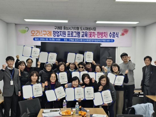 (전남=NSP통신) 김성철 기자 = 구례군은 지난 10일 구례읍 도시재생현장지원센터 2층 교육장에서 ‘오라!구례 도시재생대학(온・오프라인 판매전략 교육)’과 ‘오라!구례 창업지원 프로그램(꽃차・한방차 교육)’ 수료식을 개최했다.