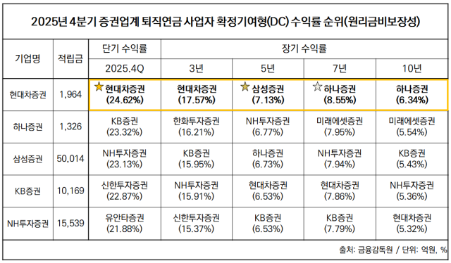 뒤이어 KB증권과 NH투자증권이 단기 수익률 상위권에 이름을 올렸다. KB증권과 NH투자증권의 4분기 단기 수일률은 각각 23.32%, 23.13%로 집계됐다. 두 회사의 4분기 DC형 원리금비보장성 적립금은 각각 1조 169억원, 1조 5539억원으로 기록됐다. 단기 구간에서는 대형사 중심의 경쟁 구조가 형성된 모습이다.