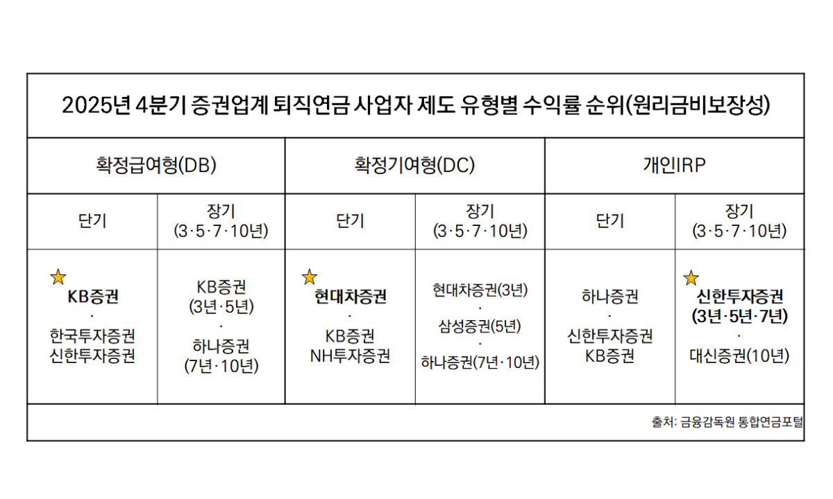 증권사 퇴직연금 수익률, DB·DC는 ‘KB·현대차’…IRP는 ‘신한’ 선두