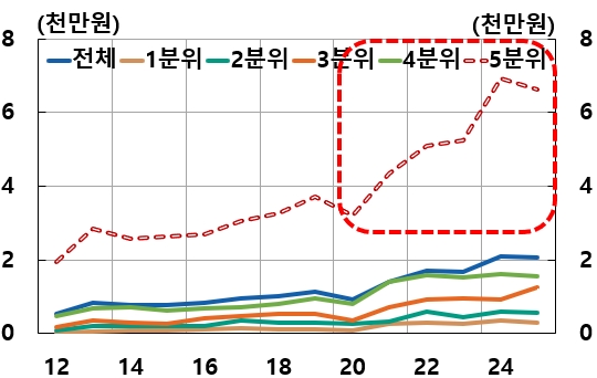 한은은 “최근 증시가 반도체 기업의 실적 기대 조정에 따라 매우 높은 가격 변동성을 보이고 있고 이는 가계로 하여금 현재의 평가이익을 가처분소득의 영구적 증가로 인식하기 어렵게 만들어 소비 진작 효과를 제약한다”며 “또 주가 상승 영향이 고소득층에 집중되어 경제 전체의 자산 효과를 낮춘다”고 설명했다.
