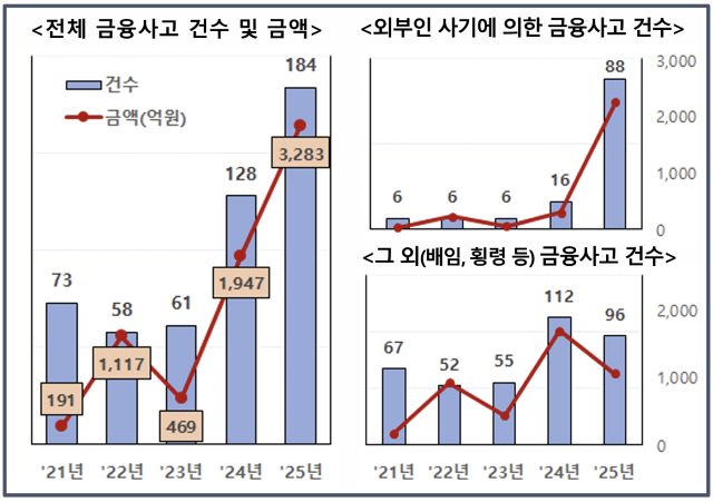 또 금감원에 따르면 지난해 금융사고 발생 건수는 총 184건, 금액은 3283억원으로 지난 2023년(61건, 469억원) 대비 가파르게 확대됐다. 그간 내부통제 제도 개선 노력 등에도 금융사고 발생 건수는 지속적으로 늘었다.