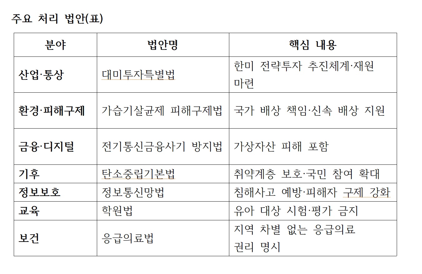 이날 처리된 안건 가운데 대미투자특별법은 첨단산업과 조선 협력 분야를 중심으로 한미 간 대규모 투자 협력의 법적 기반을 마련했다는 점에서 주목된다. 이와 함께 가습기살균제 피해구제, 가상자산 금융사기 방지, 기후취약계층 보호 등 생활·안전 관련 법안도 함께 의결됐다.