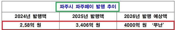 파주시는 10%의 재원을 시에서 부담하는 파주페이 발행액이 지난 2024년 2558억 원에서 2025년 3406억 원으로 증가한데 이어 올해 역시 규모가 늘어 4000억 원 초과 가능성이 큰 것으로 내다봤다.