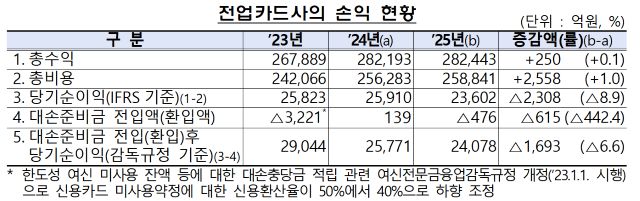 19일 금융감독원이 발표한 ‘2025년 여신전문금융회사 영업실적(잠정)’에 따르면 2025년 전업 카드사의 당기순이익(IFRS 기준)은 2조 3602억원으로 전년(2조 5910억원) 대비 2308억원(8.9%) 감소했다.