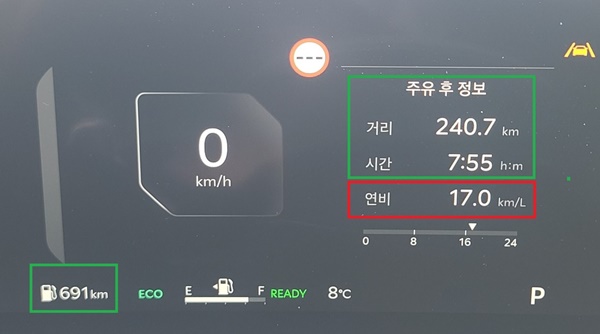 총 240.7km를 7시간 55분 동안 시승한 후 체크 한 쏘렌토 1.6 가솔린 터보 하이브리드 4WD 모델의 실제 주행 연비는 몹시 놀랍게도 17.0km/ℓ를 기록했다.