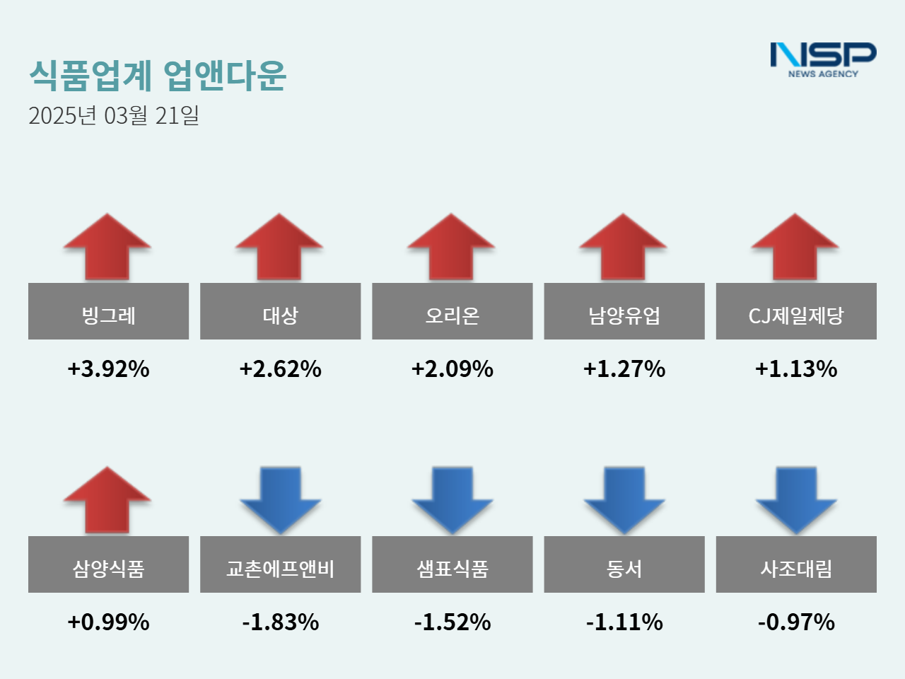 (서울=NSP통신) 옥한빈 기자 = 21일 코스피(+0.23%)는 상승, 코스닥(-0.79%)은 하락하여 엇갈리는 양상을 보였다. 이 가운데 식품주는 전거래일 대비 +0.99% 상승했다. 식품주는 90종목 가운데 36종목이 상승, 47종목이 하락했다. 보합세는 7종목이다.