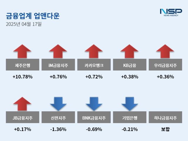 (서울=NSP통신) 강수인 기자 = 17일 코스피(+0.94%), 코스닥(+1.81%)은 모두 상승했다. 이 가운데 은행주는 전거래일 대비 0.09% 하락했다. 은행주는 11종목 가운데 6종목이 상승, 4종목이 하락했다. 보합세는 1종목이다.