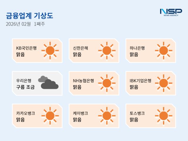 (서울=NSP통신) 강수인 기자 = 2026년 2월 1주차 금융업계기상도는 KB국민은행·신한은행·하나은행·NH농협은행·IBK기업은행·카카오뱅크·케이뱅크·토스뱅크의 ‘맑음’, 우리은행의 ‘구름조금’으로 기록됐다.