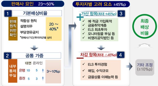 은행의 경우 검사결과 은행별로 모든 투자자에게 적용되는 적합성원칙 또는 설명의무 위반 사항이 발견돼 20~30%의 기본배상비율을 책정했다. 증권사는 대체로 증권사별 일괄 지적사항이 확인되지 않아 개별 투자자에 대한 판매원칙 위반이 확인되는 사례를 중심으로 위반사항에 따라 20~~40%의 배상비율이 적용된다.