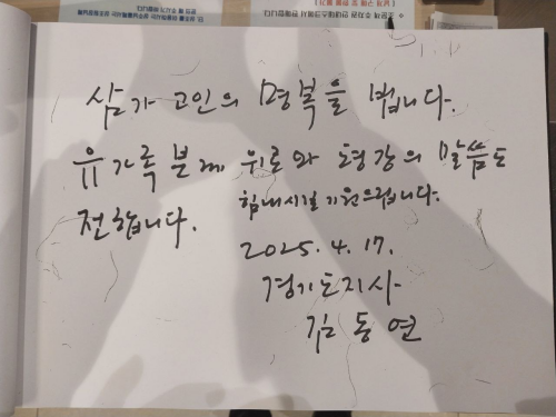 이어 김 후보는 유가족과의 대화에서 “진심으로 위로와 또 조문의 말씀을 드렸고 고인의 명복을 빌었다”라며 “유가족분들께서는 경기소방본부에서 여러 가지 악천후에도 불구하고 최선을 다해서 사고 수습과 구조해 주신 데 대해 사의를 표했다”라고 밝혔다.