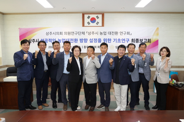 이번 최종보고회는 의원 연구단체 회원들과 관계 공무원, 학술연구용역 업체 등 20여 명이 참여해 앞으로 상주시가 가야 할 농업대전환의 ▲정책 방향 ▲농업 조례 제·개정 ▲브랜드 정책 제언에 대한 의견을 청취했다.