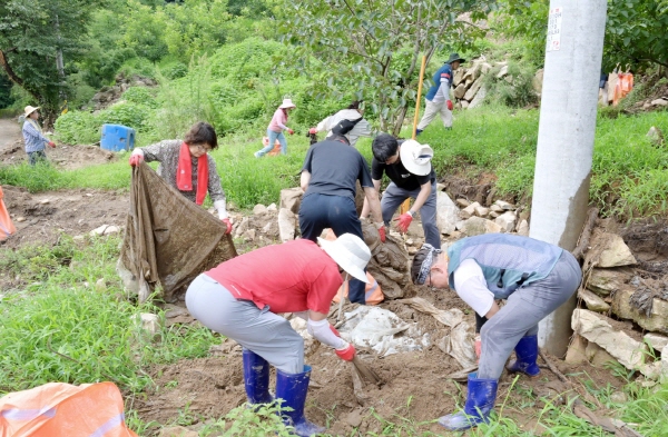 13일 새벽에 산청군으로 향한 문경시의회는 침수된 농경지의 토사를 제거하고 방치된 수해폐기물을 자루에 담아 옮기는 등 복구 활동에 구슬땀을 흘렸다.