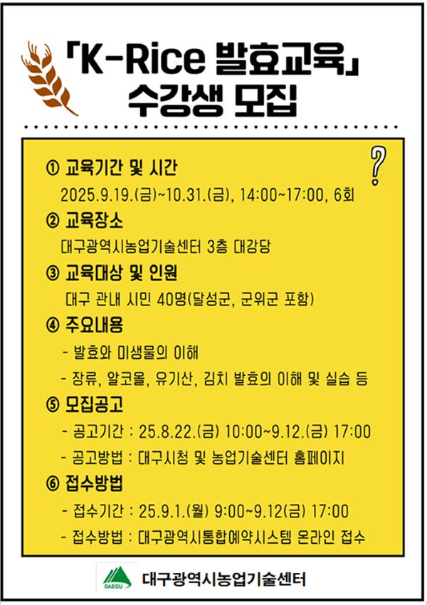 (대구=NSP통신) 장석 기자 = 대구시농업기술센터(소장 김수진)는 오는 9월 19일부터 10월 31일까지 진행되는 ‘K-Rice 발효과정’ 교육을 앞두고 발효 전문가로 성장할 수강생 40명을 모집한다.