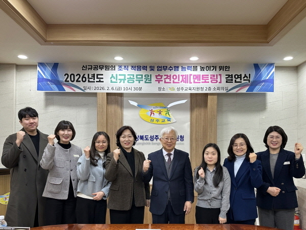 (경북=NSP통신) 김대원 기자 = 경상북도성주교육지원청(교육장 김시용)은 6일 소회의실에서 2026. 1. 1.자 신규 공무원 1명, 멘토 공무원 2명이 참석하여 신규 공무원의 조직 적응력을 높이고 자신감 있는 공직 생활을 유도하고자 후견인제(멘토링) 결연식과 직무연수를 가졌다.