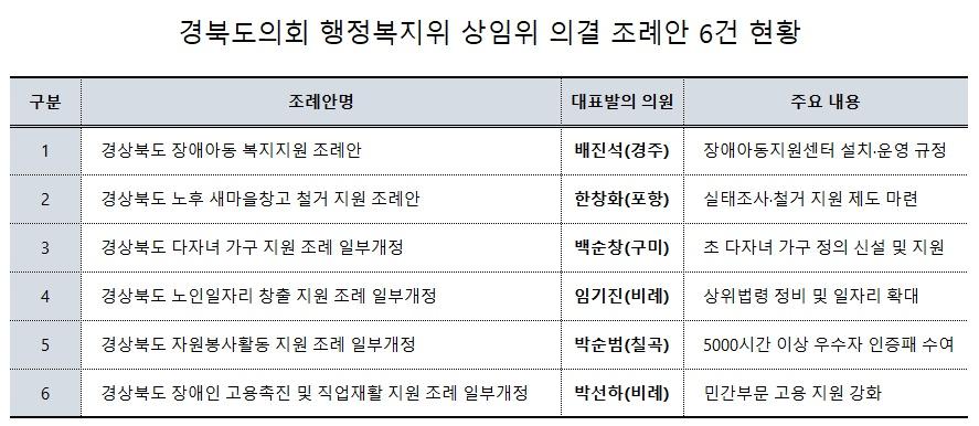 경북도의회 행정복지위, 조례안 6건 원안 가결...복지 사각지대 해소 기대(경북=NSP통신) 조인호 기자 = 경상북도의회 행정보건복지위원회가 제361회 임시회 기간 중 지난 18일 상임위 회의를 열고 소관 부서 조례안 6건을 모두 원안 가결했다.