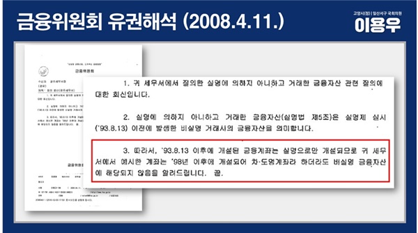이용우 의원은 “금융위원회 내부위임 전결 규정에 따라 금융실명제 관련 사항은 위원장 보고사항임에도, 해당 유권해석은 은행 과장 전결로 작성됐다”며 당시 유권해석의 절차적 하자를 지적했다.